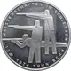 Three stylized people with firearms. Wording around circumference of rim. |