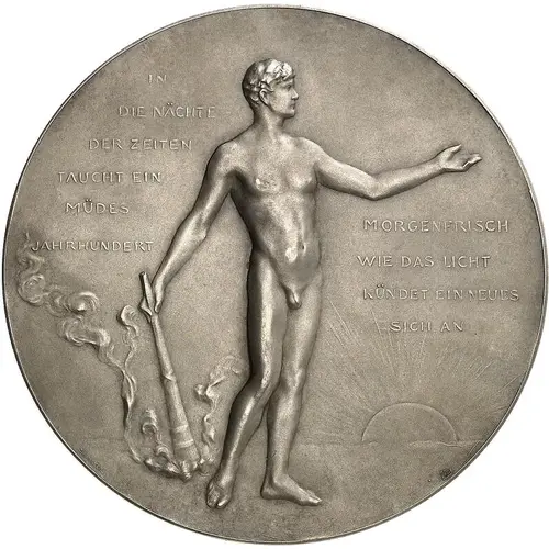 Obverse lettering IN DIE NÄCHTE DER ZEITEN TAUCHT EIN MÜDES JAHR HUNDERT MORGENFRISCH WIE DAS LICHT KÜNDET EIN NEUES SICH AN RM B.H.MAYER