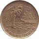 Descripción del anverso Palm tree, shoreline, ship