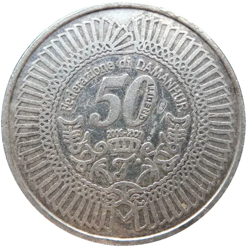 | Leyenda del anverso | Federazione di DAMANHUR 50 CREDITI 2006-XXXI ⋆ 505- 10 999 (within an incomplete oval shape) (Translation: Federation of Damanhur The Credito is the complementary currency of Damanhur 31 in Roman numerals is the Damanhuran calendar year The 505- 10 suggests it is the 10th coin out of a series of 505 in total, the 999 within the incomplete oval shape stands for 99.9% silver) |