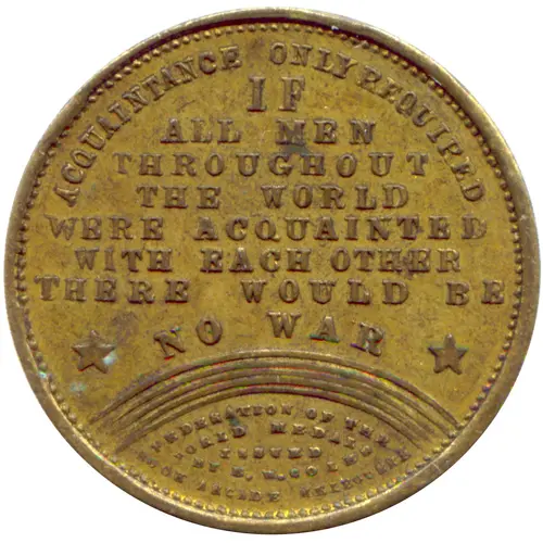 ACQUAINTANCE ONLY REQUIRED IF ALL MEN THROUGHOUT THE WORLD WERE ACQUAINTED WITH EACH OTHER THERE WOULD BE * NO WAR * (Rainbow) FEDERATION OF THE WORLD MEDALS ISSUED BY E.W. COLE BOOK ARCADE MELBOURNE |