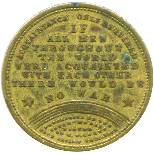 ACQUAINTANCE ONLY REQUIRED IF ALL MEN THROUGHOUT THE WORLD WERE ACQUAINTED WITH EACH OTHER THERE WOULD BE * NO WAR * (Rainbow) FEDERATION OF THE WORLD MEDALS ISSUED BY E.W. COLE BOOK ARCADE MELBOURNE |