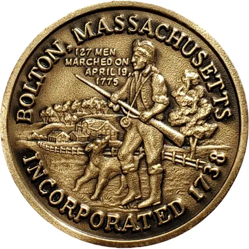 | 表面の銘文 | BOLTON, MASSACHUSETTS 127 MEN MARCHED ON APRIL 19, 1775 INCORPORATED 1738 |
