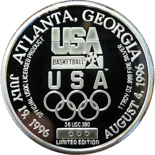 | Obverse lettering | ATLANTA, GEROGIA USA BASEKETBALL USA JULY 19, 1996 AUGUST 4, 1996 OFFICIAL USOC LICENSED PRODUCT 1 TROY OZ .999 FINE SILVER 36 USC 380 665 LIMITED EDITION |
