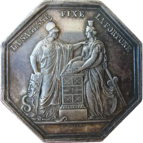 | Obverse description | Minerva (Wisdom) holding a shield on the left, her left hand resting on the shoulder of Fortune, on the right, who is pouring a cornucopia on a chest, in the exergue signature : DUMAREST. |