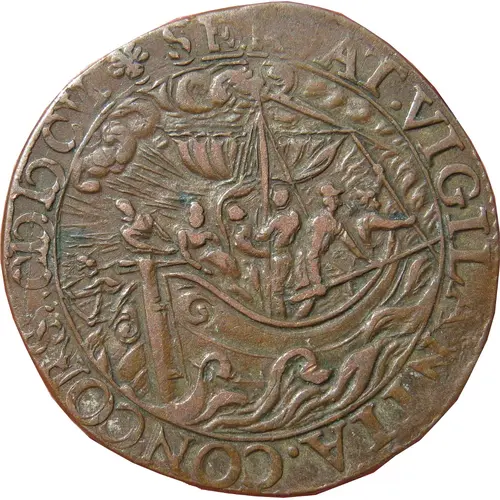 | Obverse description | Ship with sailors to the left, legend and date. |