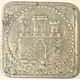 Winged shafts fill the corners. Pearled circle of 15.5mm. Castle fills the center with waves in the front of castle. |