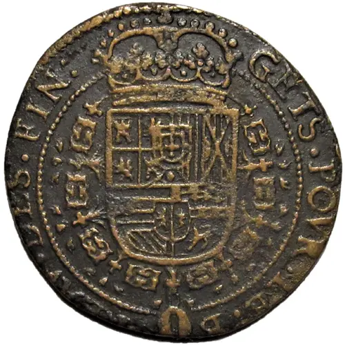| Reverse description | Weapon trophies in a circle formed by an ouroboros (a serpent biting its own tail). Latin legend around and date at top cut by a face, Mintmark for Brussels. |
