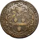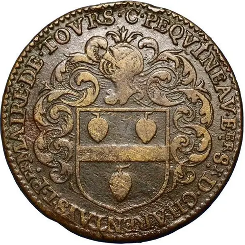 Shield with the arms of the city of Tours with three silver towers masoned sable, on a chief of azure charged with three golden fleurs-de-lis, in a crown made of two palms linked by ribbons; in the exergue -1637- Translation of the motto: Trust in the hope of Gaul |