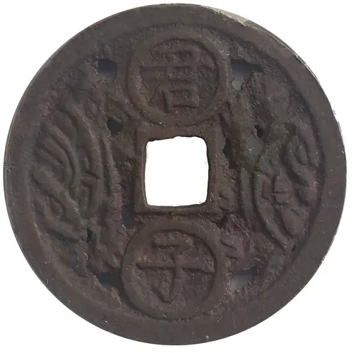 | 背面描述 | Two tortoises at 3 o`clock and 9 o`clock positions with two Chinese charaters at 12 o`clock and 6 o`clock, square hole in center. |