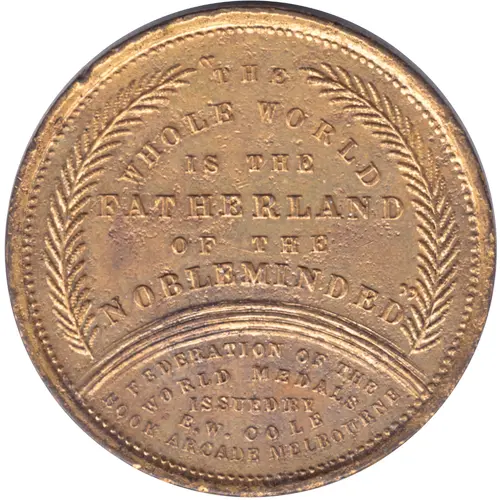 | Obverse lettering | THE WHOLE WORLD IS THE FATHERLAND OF THE NOBLEMINDED (Rainbow ) FEDERATION OF THE WORLD MEDALS ISSUED BY E.W. COLE BOOK ARCADE MELBOURNE |
