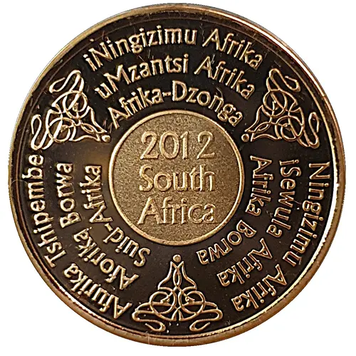 | 表面の銘文 | 2012 South Africa iNingizimu Afrika uMzantsi Afrika Afrika-Dzonga Ningizimu Afrika iSewula Afrika Afrika Borwa Afurika Tshipembe Aforika Borwa Suid-Afrika (Translation: South Africa in the 9 official languages) |