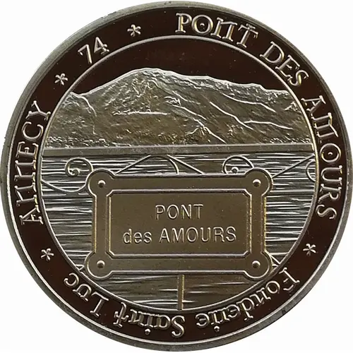 Text in periphery. In the center, representation of the bridge of the loves at the lake of Annecy in the French department of Haute Savoie, region Auvergne-Rhône-Alpes. |