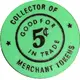Green background with black lettering. ‘COLLECTOR OF’ on top, in center circle ‘GOOD FOR 5c IN TRADE’, and ‘MERCHANT TOKENS’ on bottom. |