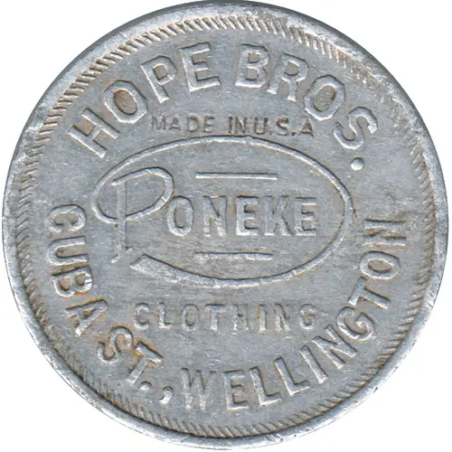 | Obverse lettering | HOPE BROS. MADE IN U.S.A. PONEKE CLOTHING CUBA ST. WELLINGTON |
