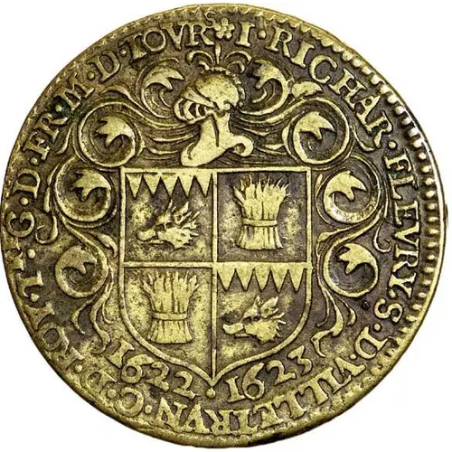 Shield of arms of Jacques Richard, King`s counselor, treasurer general of France, surmounted by a helmet with a lambrequiné grid, below 1622-1623 |