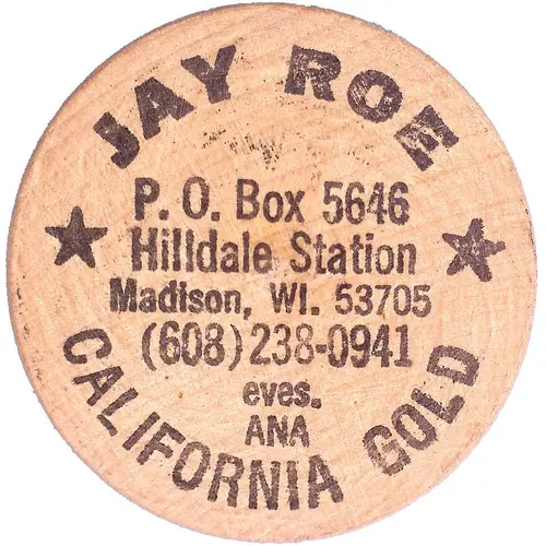 | Obverse lettering | JAY ROE P.O. Box 5646 Hilldale Station Madison, WI. 53705 (608) 238-0941 eves. ANA CALIFORNIA GOLD |
