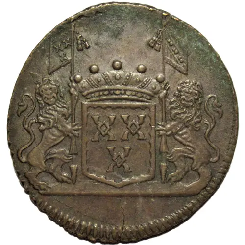 A barge on the water drawn by horses on a towpath. In the background, a city in the distance. Above, an escutcheon represents the Archangel Michael (the patron saint of Brussels). Latin legend with the date, around in an outer circle. An R, the engraver`s signature at the bottom in the reeds. |