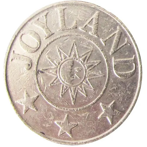 Outer circle consisting of three stars in the lower part and the inscription `JOYLAND` in the upper part. The inner circle consists of a sun with 12 triangular rays, with a superimposed moon-face. |