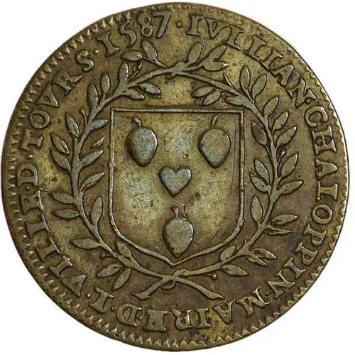 | Obverse description | Shield of arms of Jullian Chaloppin in a laurel wreath. |
