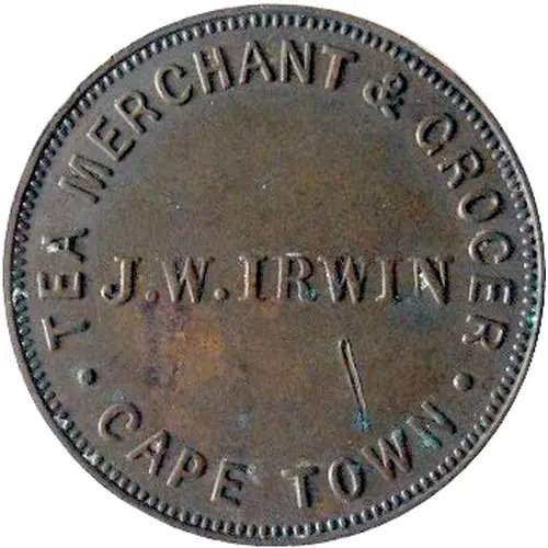 | Obverse lettering | J.W. IRWIN TEA MERCHANT & GROCER. CAPE TOWN |
