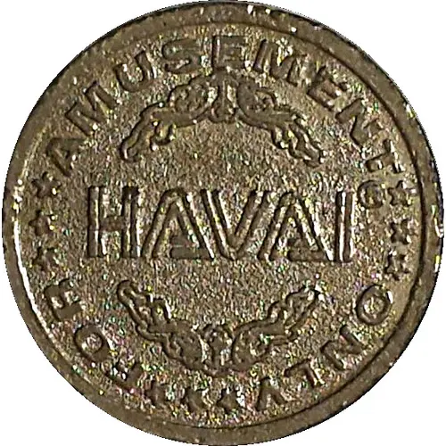 Bypassing the border, the caption formed by the phrase: FOR *** AMUSEMENT *** ONLY ***. In the center is the logotype of the company HAVAI, surmounted and superimposed on decorations. |