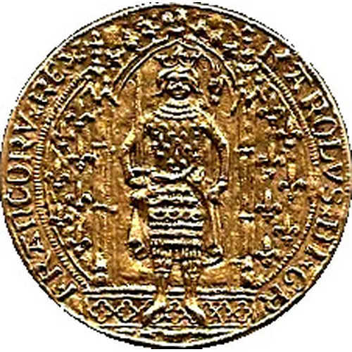 | Obverse description | Charles V, son of John II the Good, crowned with sword and hand of justice, standing under a gothic canopy. A circular inscription appears |