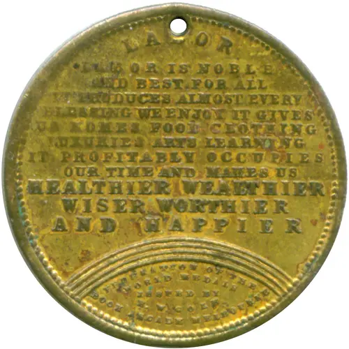 LABOR LABOR IS NOBLE AND BEST FOR ALL IT PRODUCES ALMOST EVERY BLESSING WE ENJOY IT GIVES US HOMES FOOD CLOTHING LUXURIES ART LEARNING IT PROFITABLY OCCUPIES OUR TIME AND MAKES US HEALTHIER WEALTHIER WISER WORTHIER AND HAPPIER (Rainbow) FEDERATION OF THE WORLD MEDALS ISSUED BY E.W. COLE BOOK ARCADE MELBOURNE |
