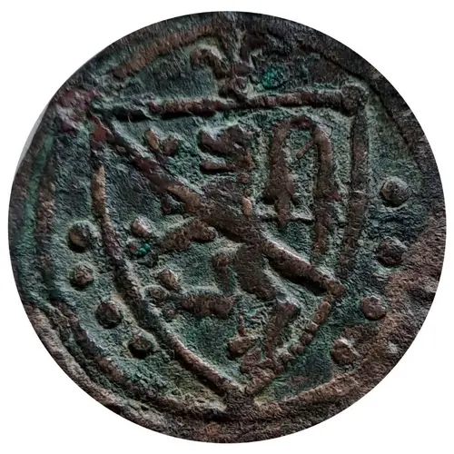 | Obverse description | Escutcheon featuring a lion charged with a spear, surmounted by a fleur-de-lys and surrounded by four large dots on either side. |