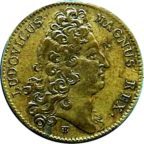 | Descrizione del dritto | Portrait (Louis XIV) right. Lettering around, letters (conjoined) below portrait. Toothed border |
