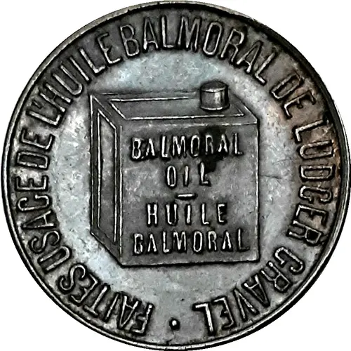 | Obverse lettering | FAITES USAGE DE L`HUILE BALMORAL DE LUDGER GRAVEL BALMORAL OIL HUILE BALMORAL |