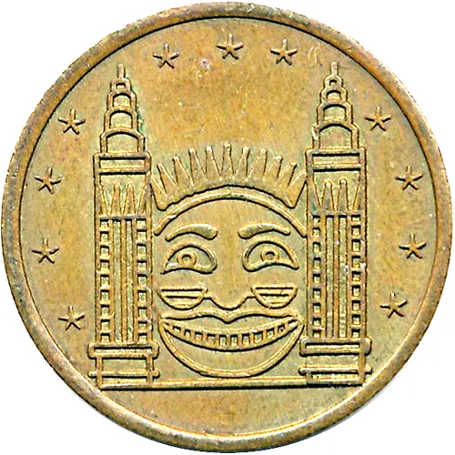 | 正面描述 | Anthropomorphic sun between two skyscrapers. Four stars beside each skyscraper. Three stars above sun. |