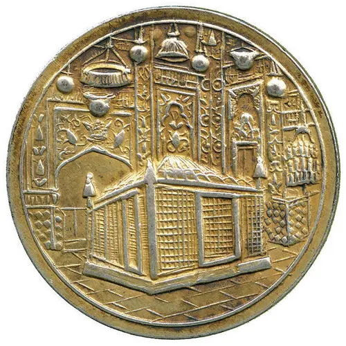 All text, with lettering in ring on outer edge and then more text inside (Persian). Middle script in Persian: Be yaad-e farkhondeh milaad-e hashtomin emaam ali ebn-e mosalreza alayh-e-salaam, Yaazdahome zighadatol haraam-e 148 hejri-e ghamari` The Persian script around the central circle: ` Dar ahd-e saltanat va toliat-e Mohammad Reza Shah Pahlavi Shahanshah-e Iran`). Date: 1338 (1959/1960) |