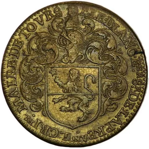 Shield with the arms of the city of Tours with three silver towers masoned sable, on a chief of azure charged with three golden fleurs-de-lis, in a crown made of two palms linked by ribbons; in the exergue -1638- Translation of the motto: Trust in the hope of Gaul |