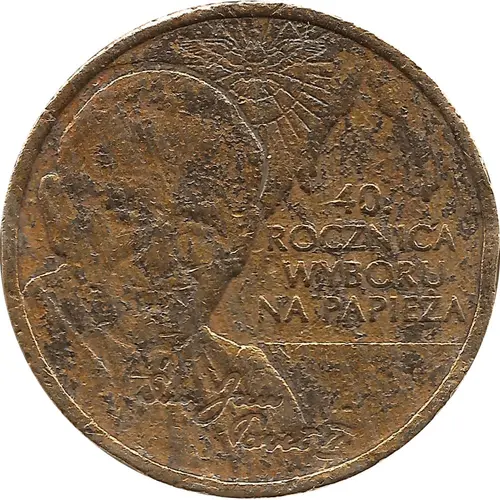| Obverse lettering | 40 ROCZNICA WYBORU NA PAPIEZA (something) John Paul II (Translation: 40TH ANNIVERSARY OF THE ELECTION TO THE POPE) |