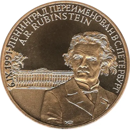 | Obverse lettering | 6.IX.1991 - ЛЕНИНГРАД ПЕРЕИМЕНОВАН В С. ПЕТЕРБУРГ A.R. RUBENSTEIN (Translation: Leningrad is renamed to St. Petersburg) |