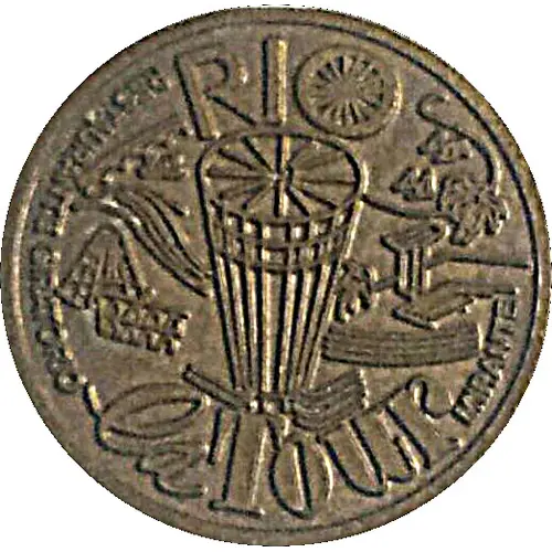 Stylized, embossed image of the Santos Dumont Building, where was the Turning Restorer, with images, also stylized, of some tourist points possible to be seen through the windows of the restaurant. On the image of the Building, in large letters, the word RIO, being that in the center of the `O` there are 16 rays, supposedly simulating the image of the Sun. Below the image of the building, in large letters the phrase `la Tour`. On the sides, in smaller letters, on the right the legend RESTAURANTE GIRATORIO and the left the legend MIRANTE. |