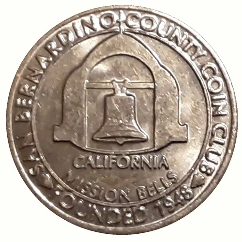 | Obverse lettering | SAN BERNARDINO COUNTY COIN CLUB CALIFORNIA MISSION BELLS FOUNDED 1948 |