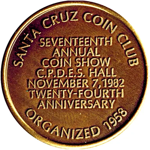 | نوشتههای روی مدال | SANTA CRUZ COIN CLUB SEVENTEENTH ANNUAL COIN SHOW C.P.D.E.S. HALL NOVEMBER 7, 1982 TWENTY-FOURTH ANNIVERSARY ORGANIZED 1958 |