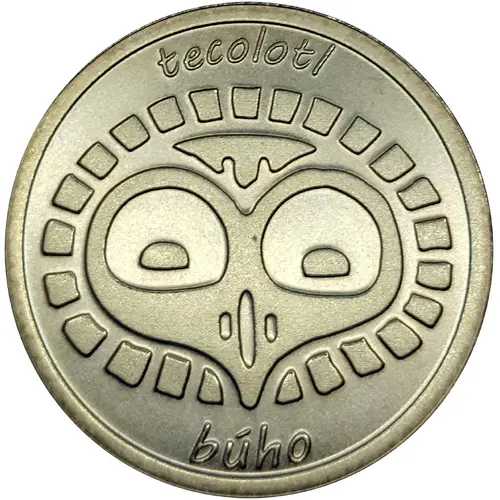 Obverse description Nahuatl word `tecolotl` over idealized symbol for owl and translation on bottom.