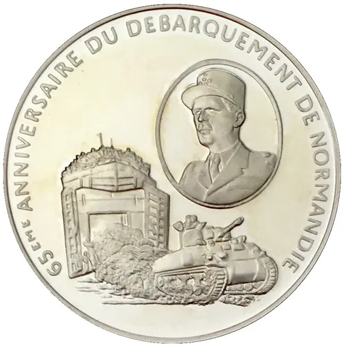 Bust of General Philippe Leclerc de Hauteclocque in medallion. Landing scene where an M4 Sherman tank is launched onto French soil from the ship USS LST-517, cheered from the deck of the ship by French soldiers of General Leclerc`s 2nd Armored Division. |