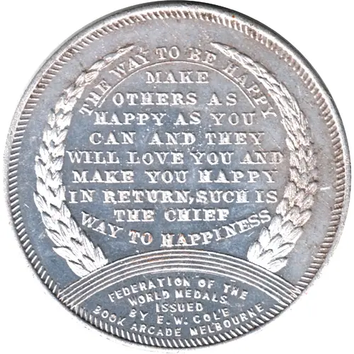 THE WAY TO BE HAPPY MAKE OTHERS AS HAPPY AS YOU CAN AND THEY WILL LOVE YOU AND MAKE YOU HAPPY IN RETURN , SUCH IS THE CHIEF WAY TO HAPPINESS (Rainbow) FEDERATION OF THE WORLD MEDALS ISSUED BY E.W. COLE BOOK ARCADE MELBOURNE |