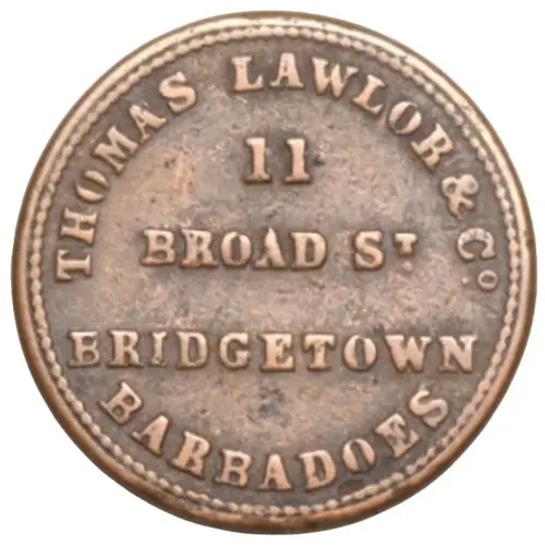 Obverse lettering THOMAS LAWLOR & CO. 11 BROAD ST. BRIDGETOWN BARBADOES