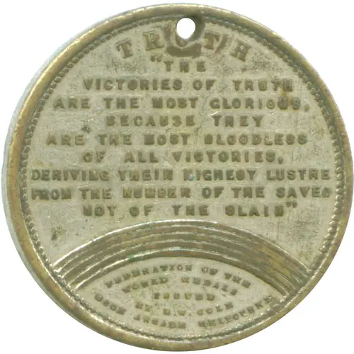TRUTH ` THE VICTORIES OF TRUTH ARE THE MOST GLORIOUS BECAUSE THEY ARE THE MOST BLOODLESS OF ALL VICTORIES DERIVING THEIR HIGHEST LUSTER FROM THE NUMBER OF THE SAVED NOT OF THE SLAIN` (Rainbow) FEDERATION OF THE WORLD MEDALS ISSUED BY E.W. COLE BOOK ARCADE MELBOURNE |