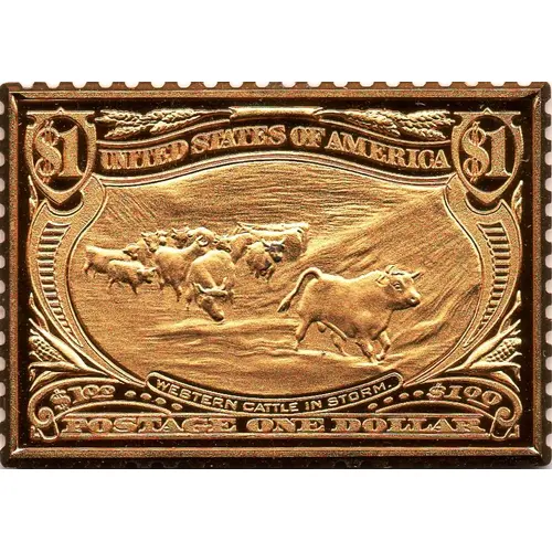 | Obverse lettering | 1$ UNITED STATES OF AMERICA 1$ POSTAGE ONE DOLLAR WESTERN CATTLE IN STORM |