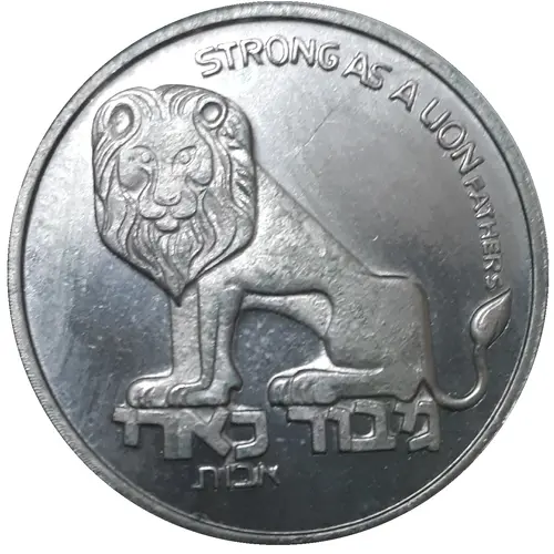 | Obverse description | Seated lion with the passage `STRONG AS A LION` and source, `FATHERS`, in Hebrew and English. |