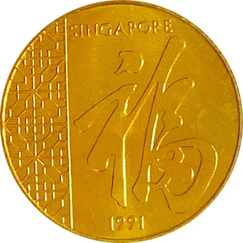 | Obverse description | Stylized Chinese art on the left, with the legend SINGAPORE above, the chinese character (fu) which means `good fortune` or `blessings` in the center. The year of issue 1991 is below. |