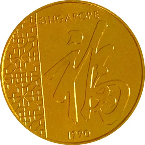 | Obverse description | Stylized Chinese art on the left, with the legend SINGAPORE above, the chinese character (fu) which means `good fortune` or `blessings` in the center. The year of issue 1990 is below. |