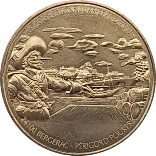 Savinien de Cyrano de Bergerac presents the river port and the town of Bergerac, a French commune in the Dordogne department, New Aquitaine region. On the right, a bunch of grapes above several barrels. |