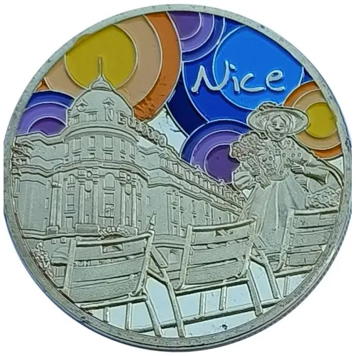 | Obverse description | Nice woman in folk costume in front of the blue chairs in front of the Negresco hotel on the Promenade des Anglais in Nice, French commune of the Alpes-Maritimes department, Provence-Alpes-Côte d`Azur region. Fireworks in the sky of Nice. |